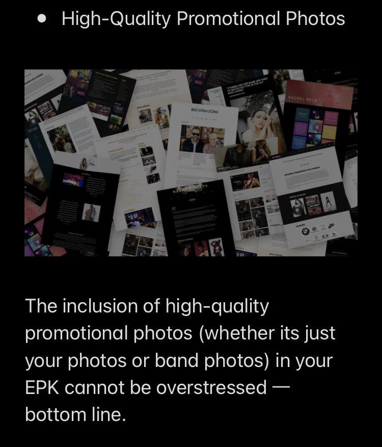 The inclusion of high-quality promotional photos (whether its just your photos or band photos) in your EPK cannot be overstressed 一 bottom line.