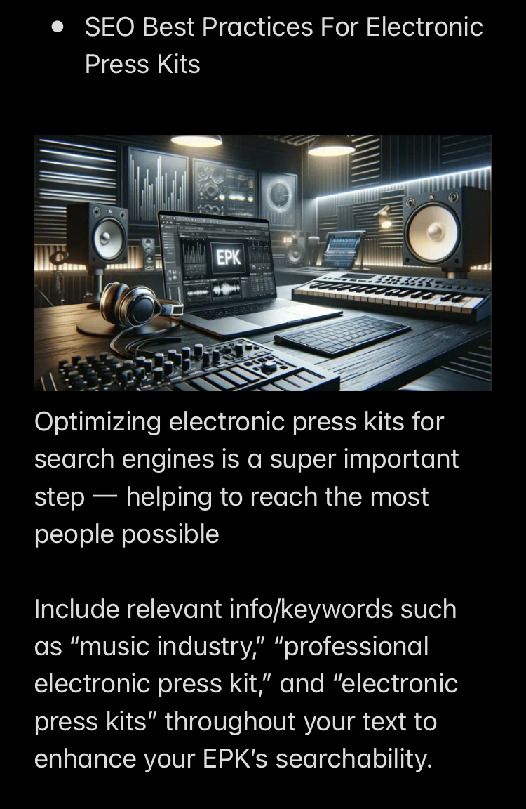 Remember, the more optimized your EPK is, the easier it will be for potential collaborators, industry professionals, and fans to find you.