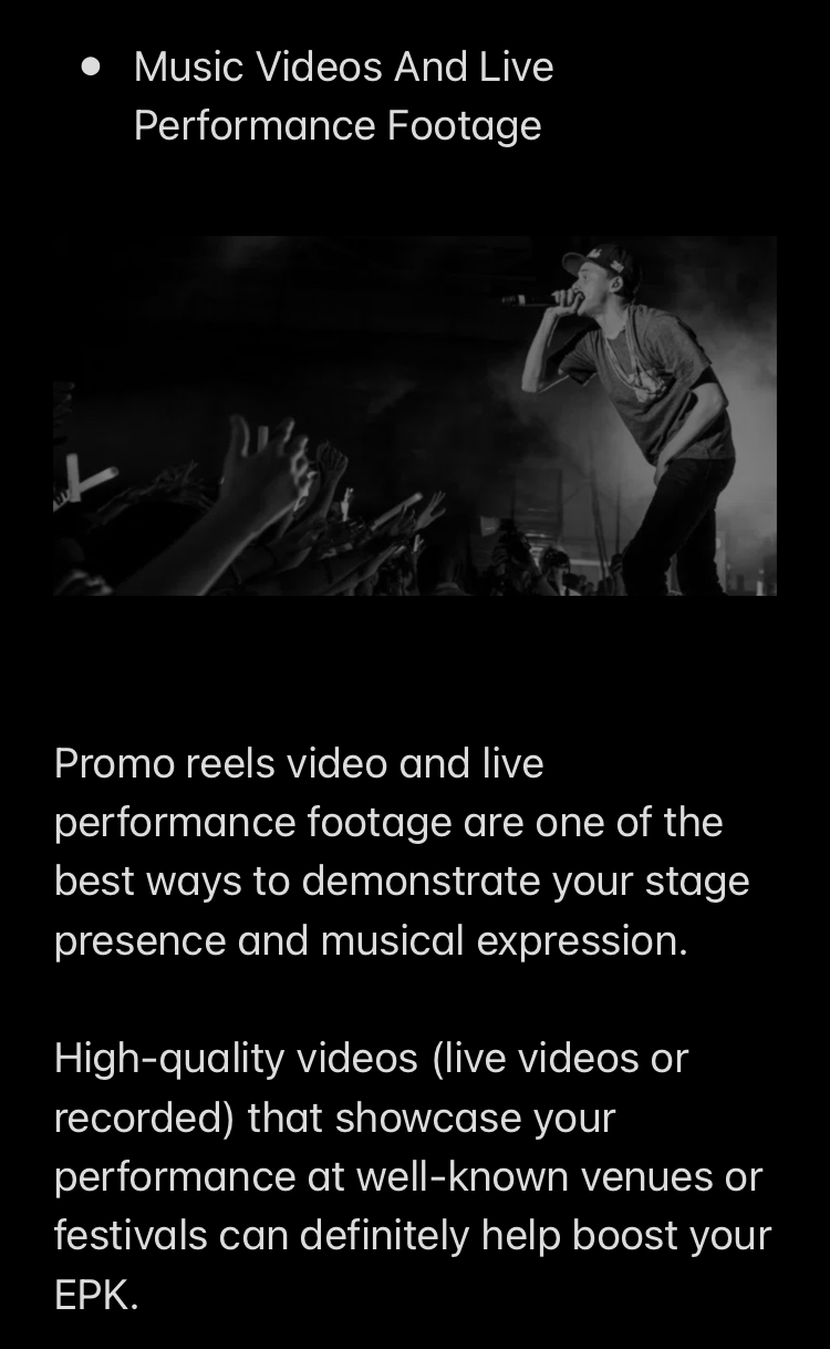 High-quality videos (live videos or recorded) that showcase your performance at well-known venues or festivals can definitely help boost your EPK.